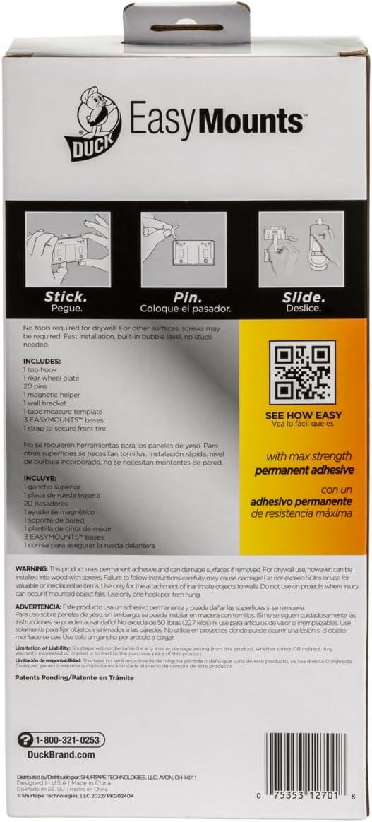 Duck Brand EasyMounts Heavy-Duty Bike Docks are a great option for garage storage and offer easy access, while keeping your bike out of the way. Supported on the ground instead of having to lift the bike for storage, this bicycle mount can be assembled in vertical or horizontal positions and can pivot 30 degrees in both orientations. Each heavy-duty mount supports 20-29 in. tires and holds up to 50 lb. of weight and installs in drywall in minutes — just stick, pin & slide. Tool-free and easy to install, EasyMounts lets you to ditch the toolbox and get your mind out of the clutter.