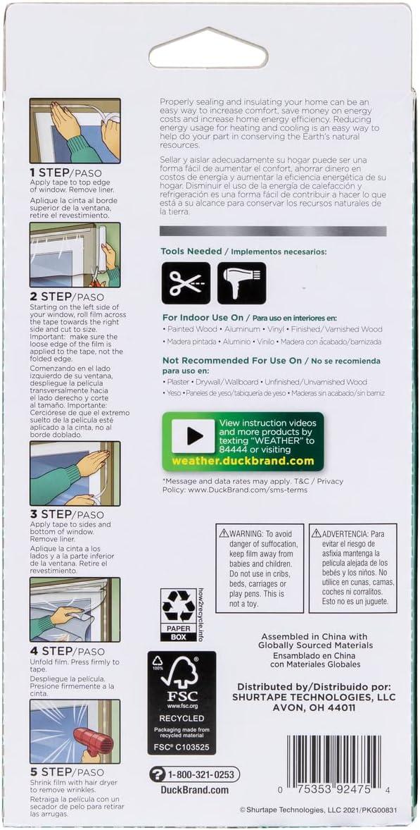During the cold weather months, windows become a prime spot for energy loss. Duck Brand Rolled Window Kits create an added barrier between the outdoor air and the inside of your home, helping block drafts and air leaks that lead to high heating costs. Our window kit film comes in an easy-to-use roll of shrink film, which means no measuring needed — simply cut the extra film off once applied. Plus, the kit uses crystal clear shrink film for good visibility and is easy to install and remove. For best results, use on clean and dry surfaces, such as painted or finished wood, aluminum or vinyl.